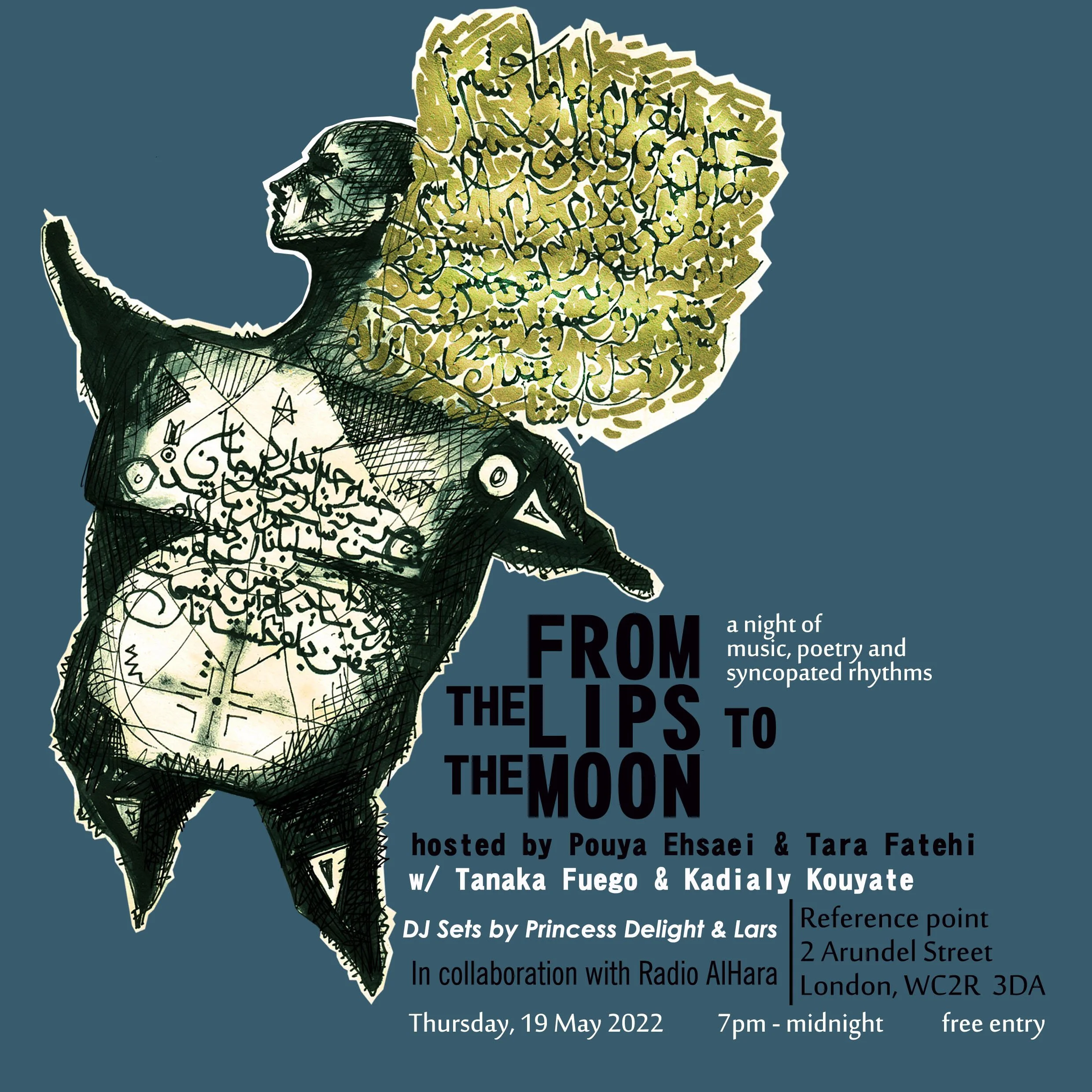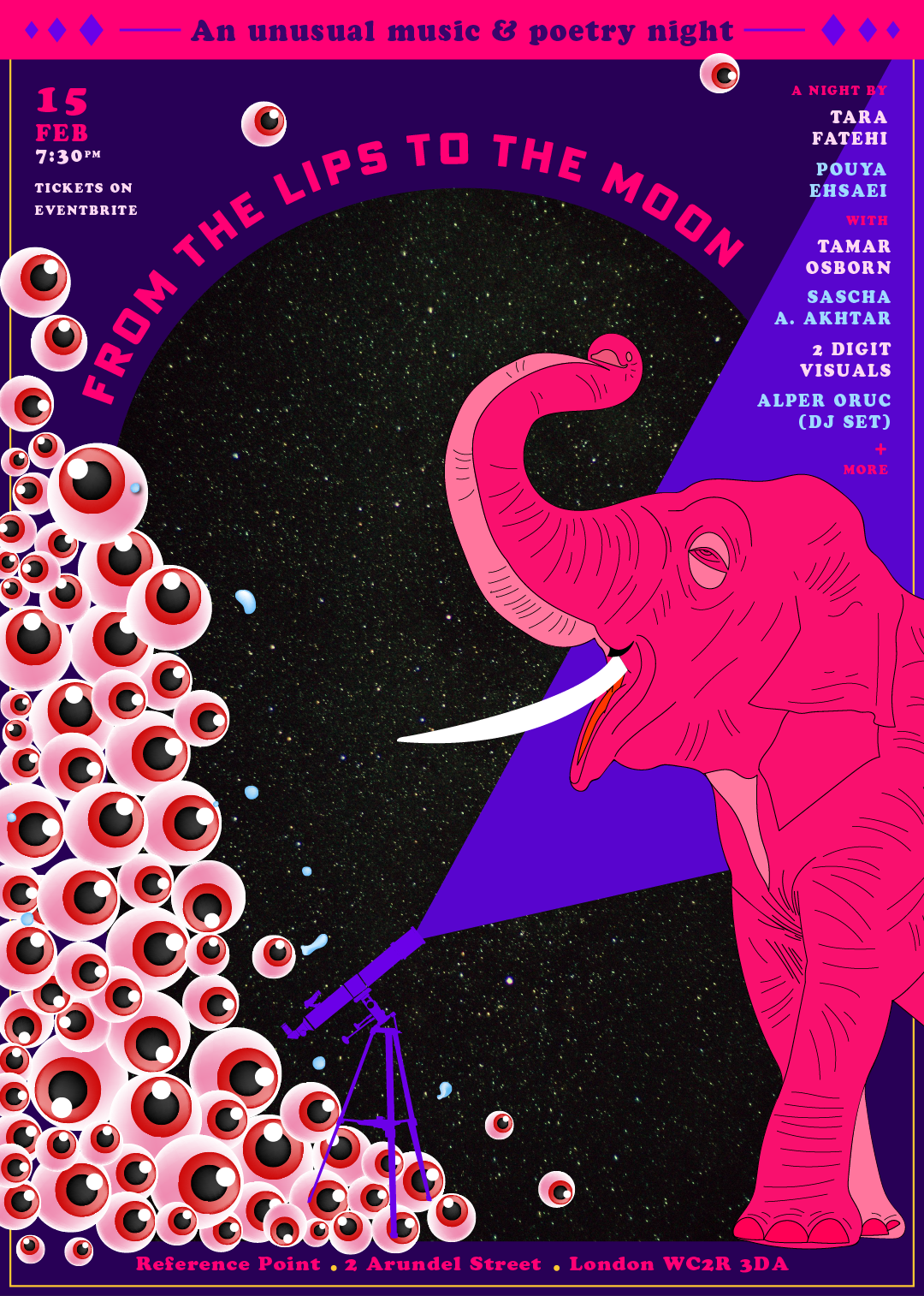 From the Lips to the Moon is a recurring performance night bringing together poets and musicians hosted by electronic music wizard and composer Pouya Ehsaei and performance maker, performer and writer of crazy texts Tara Fatehi.